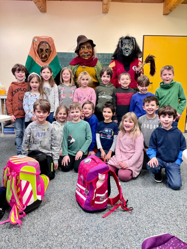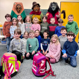 Drei Masken der Narrenzunft Bergatreute besuchten heute die Grundschüler der Klasse 1. Jordanhexe, Hagelbock und Berengar kamen in die Schule und stellten jeweils ihr Häs vor. Wie ist die Figur entstanden? Was hat die Figur dabei? Warum sehen die Masken so aus? Alle Fragen der Kinder wurden beantwortet. Nach einem „Berengar – alles klar“ gingen die Masken wieder. Die Schüler hatten anschließend noch Zeit, die Figuren zu zeichnen.