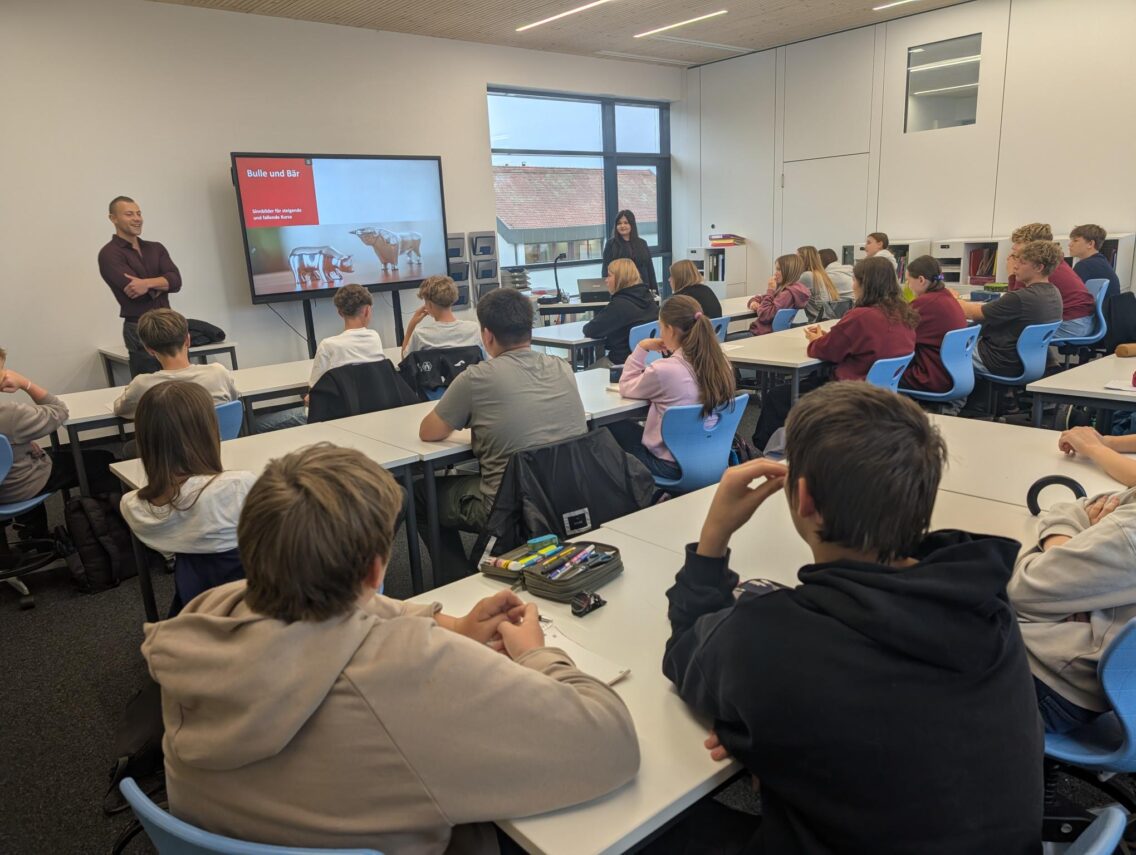 Zum Schuljahresbeginn fand für unsere 9. Klassen eine spannende Informationsveranstaltung zum Planspiel Börse statt. Die Referenten Herr Schuler und Frau Ademi führten die Schülerinnen und Schüler mit viel Fachwissen in die Welt der Börse ein. Dabei wurden grundlegende Begriffe wie Aktien, Kurse und Rendite erklärt und diskutiert.